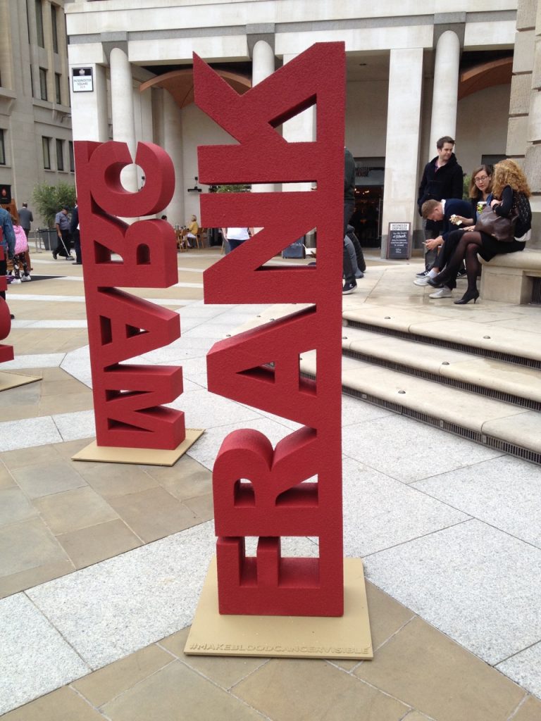 The 3D letterform sculpture of Frank Mercer is one of over 100 on display in Paternoster Square throughout September for blood cancer awareness month.