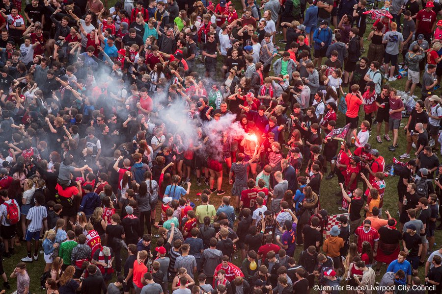 Crowds celebrating Liverpool’s Premier League title win descended on the Pier Head in their thousands despite repeated pleas from authorities to stay away.