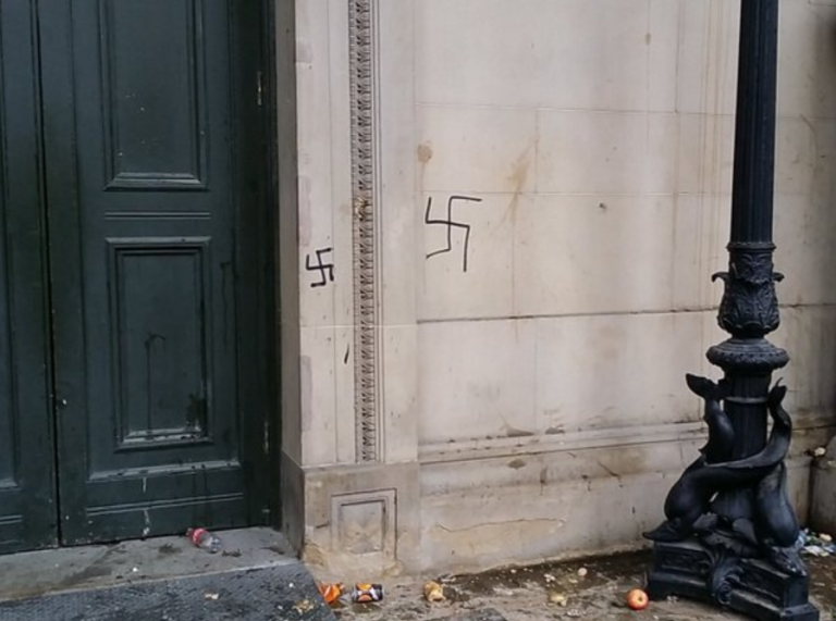Swastika symbols were daubed on the listed building during the ugly scenes, which resulted in 33 arrests and cost an estimated £60,000 in policing costs.