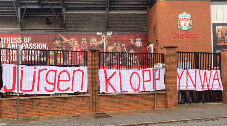 Reds fans showed their solidarity with Klopp, whose mother passed away last month, by hanging a banner in support of him on the gates outside Anfield.